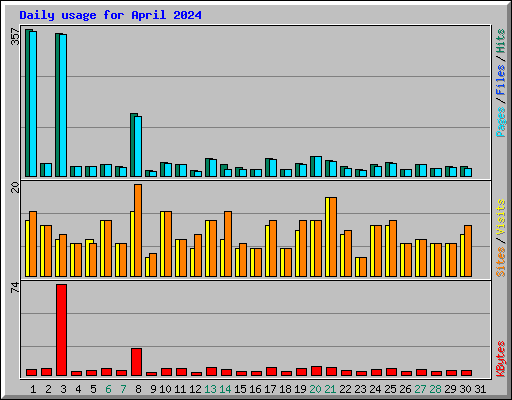 | Day | Hits | Files | Pages | Visits | Sites | KBytes | ||||||
